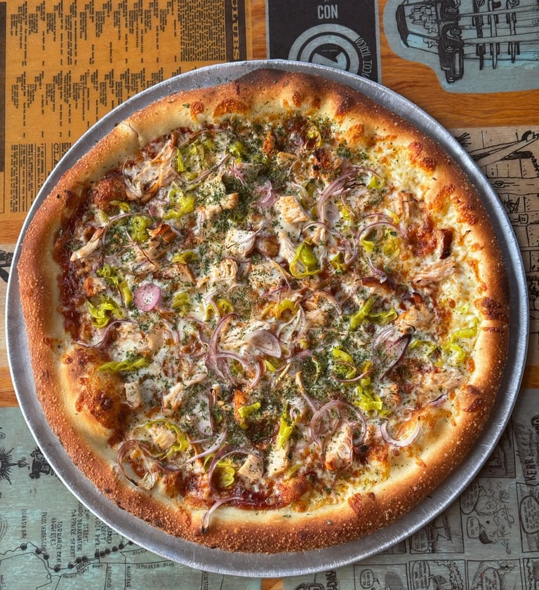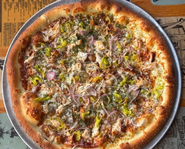 BBQ sauce -Mozzarella cheese -Fresh grilled chicken -Red onion -Parsley Flakes-pepeoncini