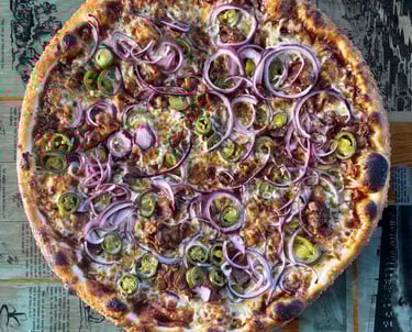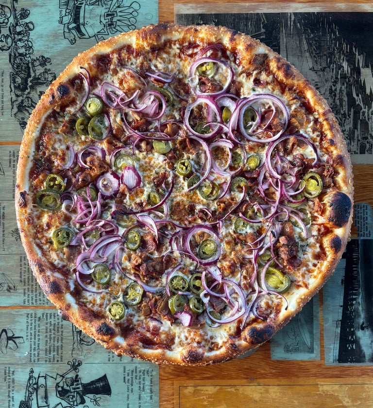 Bbq sauce -Mozzarella -Red onion -Jalapeño -Sausage -Bacon -Parsley