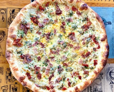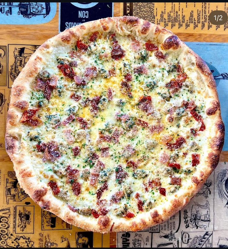 Baby clams, bacon, calabrian chili, white sauce, mozzarella, garlic, parmesan, parsley, lemon
